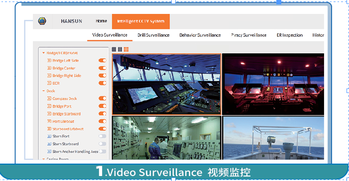 船舶AI+CCTV系统包括船基系统和岸基系统,船基AI+CCTV用于辅助船舶航行及可视化管理,岸基AI+CCTV在线多维度监控和管理多达数百艘船舶。